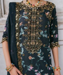 The digitally printed lawn shirt is enhanced with a heavy embroidered neck patch, beautifully crafted with zari and sequence work, further elevated with lock moti handwork — giving it a luxurious original-style finish.