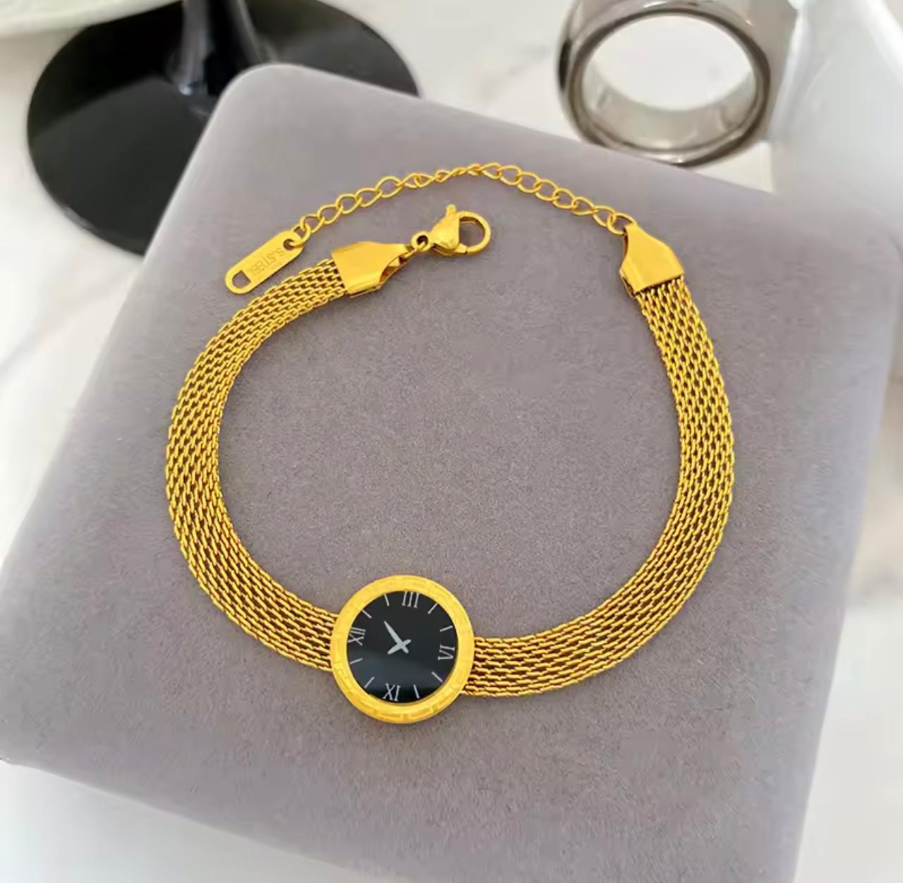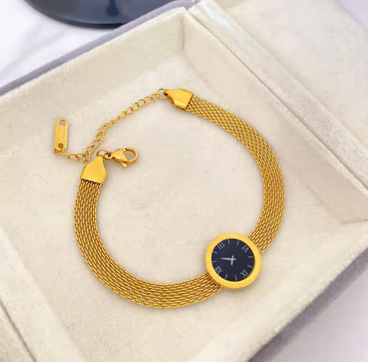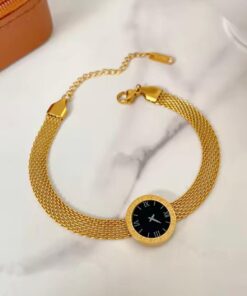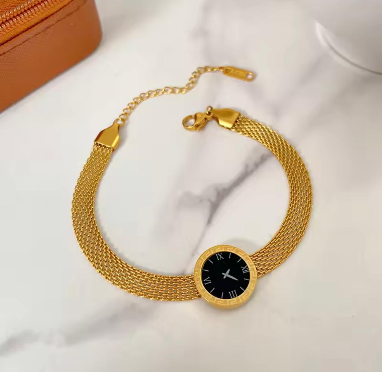 The Golden Timepiece Bracelet redefines elegance by blending the structure of a watch with the sophistication of fine jewelry. Designed with a polished golden bracelet body and a deep black dial, this piece delivers a powerful contrast that instantly elevates your look.