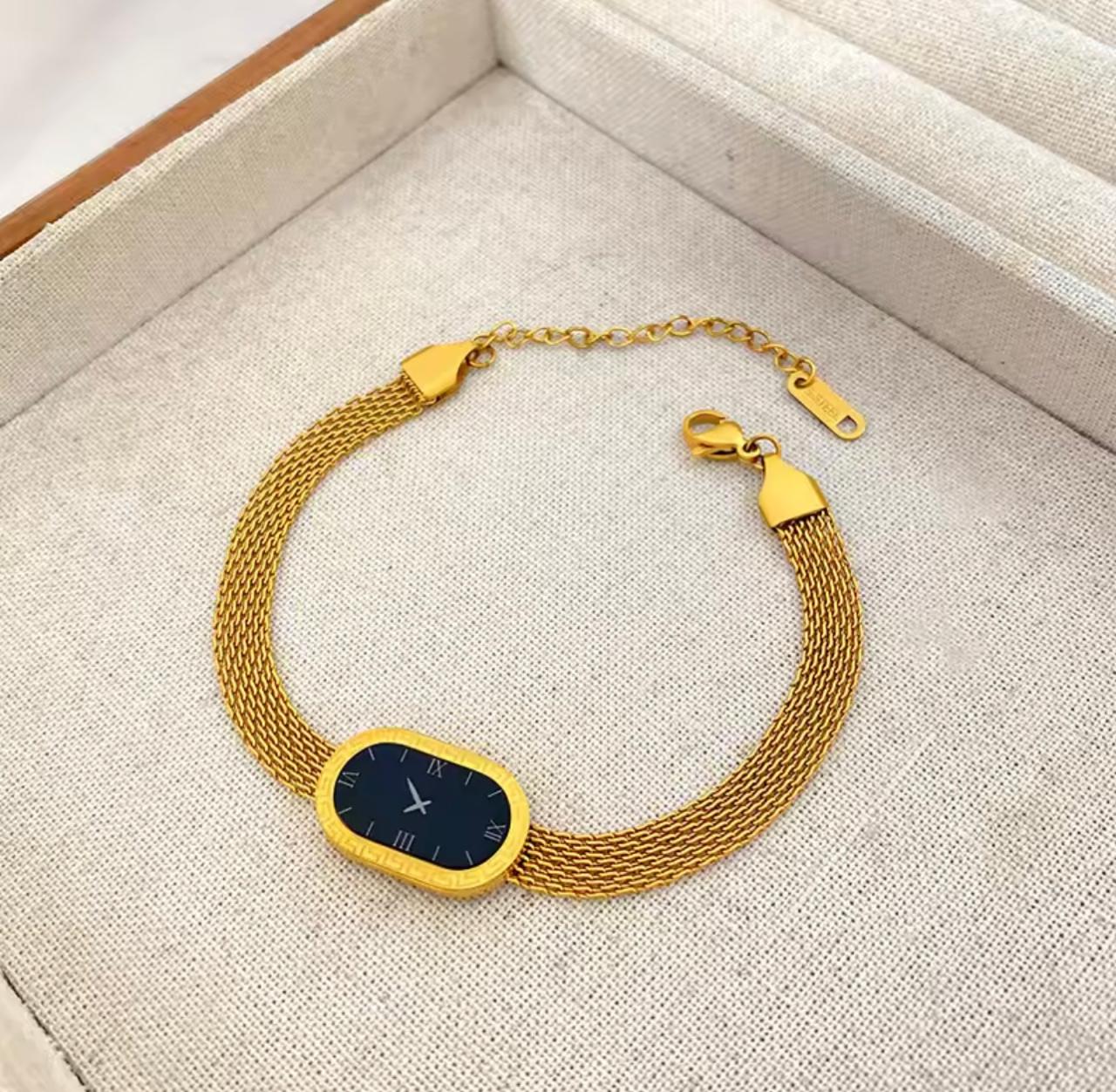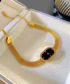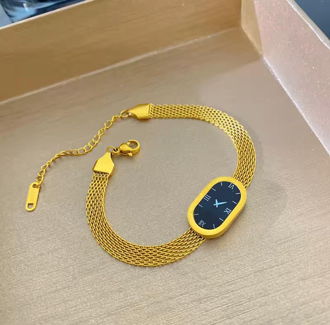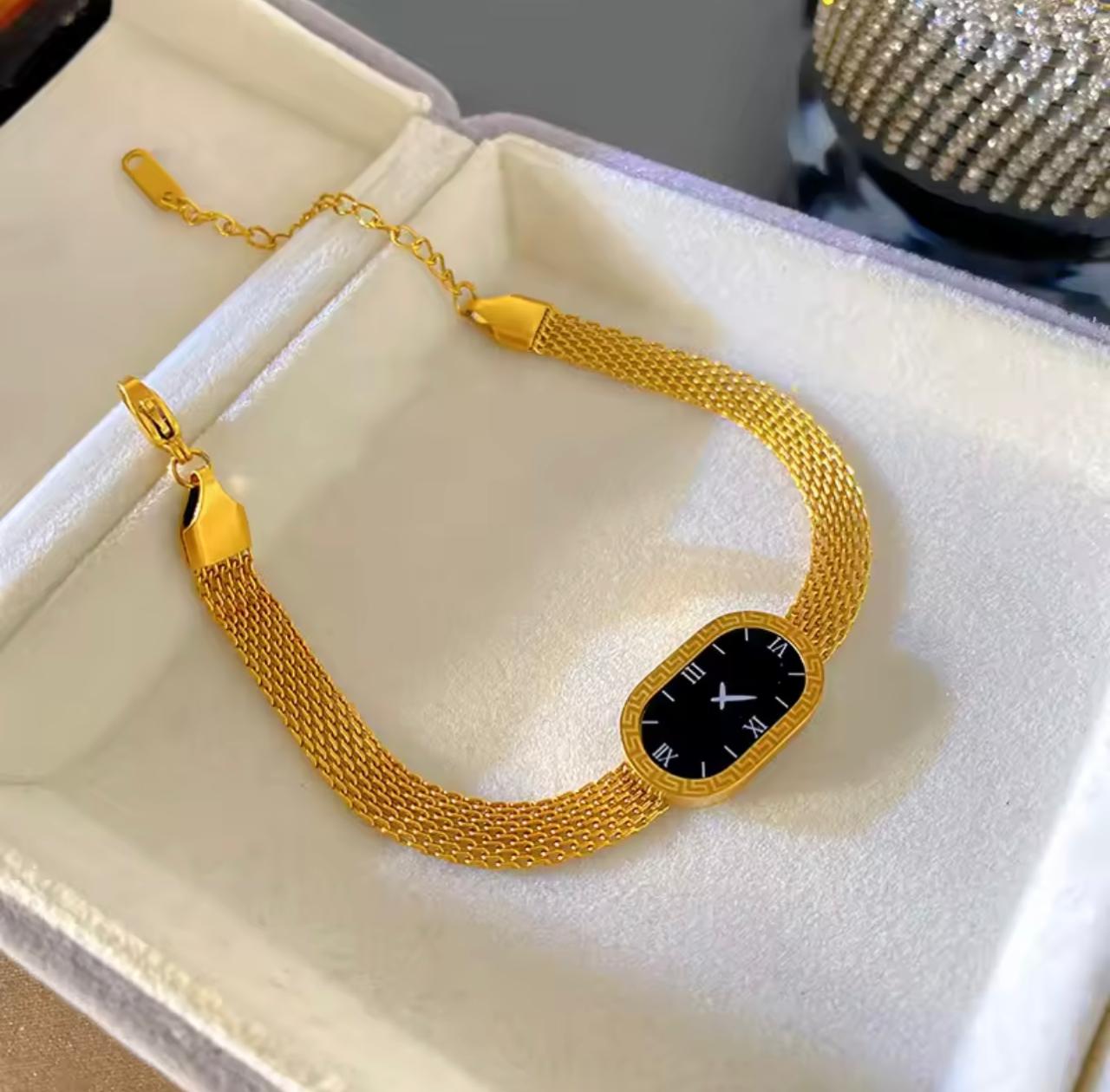 The Golden Timepiece Bracelet redefines elegance by blending the structure of a watch with the sophistication of fine jewelry. Designed with a polished golden bracelet body and a deep black dial, this piece delivers a powerful contrast that instantly elevates your look.